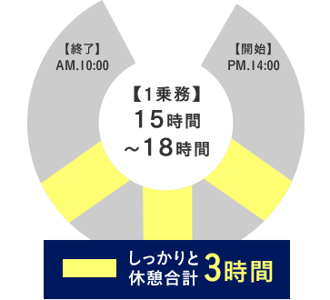 1乗務あたり実働時間は15時間30分(休憩時間3時間あり)