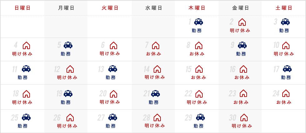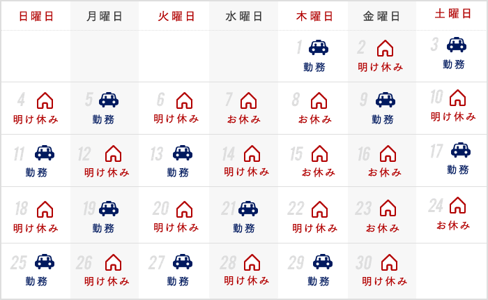 1日おきの勤務で1ヶ月に11~13勤務となります。
